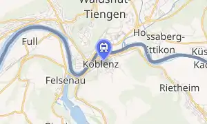 Koblenz Dorf station should not be confused with Koblenz station, which is situated rather further from the centre of Koblenz. Koblenz station is served by the same trains that serve Koblenz Dorf station, with the addition of further S27 trains between Baden and Waldshut.[4][5][6]