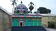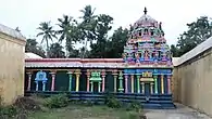 Kola Valvill Ramar Temple is located in Tiruvelliyangudi, a village located 19 km (12 mi) away from the Kumbakonam on the Kumbakonam - Chennai highway. The temple has a three-tiered rajagopuram (gateway tower) and is enclosed within brick walls. Leaving the central shrine of the presiding deity, which is built with granite, all the other shrines are built with brick.[6] There are separate shrines for the consort of Kolavalli Ramar, Maragathavalli.[7] The presiding deity, Kola Valvill Ramar, is sported in Bhujanga sayan (reclined) posture. The vimana (roof over the sanctum) has Varthaga vimana pattern. There are four water bodies namely, Sukra, Brahma, Indra and Parasara that are associated with the temple.[8]