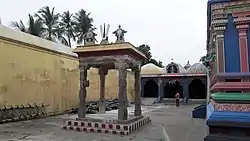 The temple is counted as Vaishnava Sukra Kshetra as Vishnu appeared as a beautiful deity to please his devotee Sukra (Venus).[9] The place derived its name Thiruvelliyangudi hence and the presiding deity is also referred to as Velliyan. It is believed that Vishnu appeared in Kalyana Kolam (marriage posture) to Parasarar, Markendeyar, Mayan, Brahma, Sukran and Bhudevi. To de-stress or relieve Lord Vishnu, his mount or vahana, the eagle Garuda, holds the conch and the Sudarshana Chakram or disck-like wheel of Vishnu which is unique in nature, making this the only temple where Garuda is depicted in such a posture. Sage Parasarar is believed to have done penance in this temple and hence there is a temple tank called Parasara Theertham. A banana plant is seen growing from a granite base and it is believed to be historical.[6] The temple is revered in Nalayira Divya Prabandham, the 7th–9th century Vaishnava canon, by Thirumangai Alvar in one hymn. The temple is classified as a Divyadesam, one of the 108 Vishnu temples that are mentioned in the book.[7]