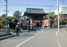 It is believed this is what the Azuma Kagami calls "Komachi Ōji" and other texts "Komachi Kōji".[2][3] It used to be also called Machi Kōji (町小路).[2] The name seems to stem from the fact that the Ebisudōbashi Bridge has been for centuries the border between the two areas called Komachi and Ōmachi,[2] Komachi being the more important of the two. The Azuma Kagami says that along Komachi Ōji there were the houses of the powerful (the gokenin) and, for almost the entire Kamakura period, the seat of the government.[3] The entrance of all buildings in Komachi not belonging to the Hōjō (the ruling clan) or to the Bakufu (with the curious exception of houses of ill repute) had to face away from Wakamiya Ōji (Honkaku-ji is a good example).[3][4]