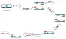 There are three components that are critical to the KASP assay: 1) a purified DNA sample, 2) two allele-specific forward primers, and 3) a common reverse primer. A minimum of 5-10 ng of the extracted DNA sample is required for the method to function properly. The DNA sample is purified by adding a mixture of chemicals to the buffer solution.[2] In the first round of PCR, a KASP primer mix that contains the two allele-specific forward primers and the single reverse primer is added to the mixture. The specific nature of the forward primers allows for the primer to bind solely at the SNP of interest, allowing DNA polymerase to lay down the rest of the complementary nucleotides. During this time, the common reverse primer begins to lay down complementary nucleotides on the opposite strand of DNA. This ends the first round of PCR.[2]