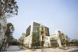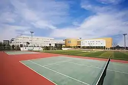 The school campus comprises two main areas connected by a bridge: the elementary and middle school (completed in September 2011),[19] and the high school (completed in August 2014).[20] In total, there are 12 buildings with 110 classrooms. The Elementary and Middle School Campus includes separate academic buildings, each with its own library, music practice rooms, auditoriums; shared facilities include a mid-sized turf athletic field, tennis and basketball courts, 25m swimming pool, and three dormitories. The high school campus includes an academic building; sports facilities including a 25m swimming pool, gymnasium, turf soccer field, outdoor tennis and basketball courts, and golf practice room; and four connected dormitories. The school maintains an additional Olympic-sized soccer field and 400m track across from the elementary and middle school. School libraries hold approximately 50,000 volumes.
