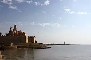 The temples, on a sandstone mound about a mile to the north-west of the village, rising boldly from the sea that washes their western face, are enclosed by a fortified wall, the gate approached by three flights of steps. A writing on the left side of the gate shows that the present fort and temples were built in 1820 (Samvat 1877) by two Seths, Sundarji and Jetha Shivji, Brahma-Kshatris by caste. The courtyard is surrounded by a battlemented wall armed formerly with three small guns. In the middle, on a platform 41⁄2 feet high 631⁄2 long and 49 broad, is a handsomely built stone temple of Mahadev. The porch has three domes with, under the central dome, a large and beautiful brass bull presented by Rao Deshalji I of Cutch State; in the right dome a large statue of Hanuman and in tho left dome one of Ganpati. Inside the porch is the hall, mandap, 19 feet 9 inches long and 24 feet 8 inches wide, with a large central and two side domes. On a marble tablet, let into the centre of the hall floor, the names of Kshatri Jetha and Sundarji Shivji are humbly cut that the feet of the worshippers may tread on them. At the inner end of the hall and between it and the shrine are, on either side, figures of Ganpati and Hanuman. In the screen wall of the shrine are two inscriptions referring to the rebuilding of the temple in 1820. The frame of the door is of carved stone. The door itself, 21⁄2 feet wide and 123⁄4 high, is plated with carved silver. The shrine, paved with black marble, is 111⁄2 feet square. In the back wall is an image of Parvati, and in tho west wall are two images of Ganpati and Revaji. In the centre of a basin, jaladhari, rather far back in the shrine, is a four feet high ling of the kind called self-born, svayambhu. In the point of the ling are some iron nails driven into it, according to the local story, by Alauddin Khalji in 13th century.[1][3]