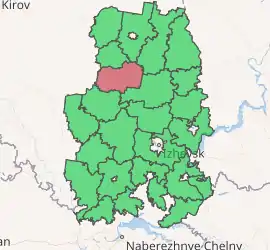 Krasnogorsky District (Russian: Красного́рский райо́н; Udmurt: Красногорск ёрос) is an administrative[1] and municipal[7] district (raion), one of the twenty-five in the Udmurt Republic, Russia. It is located in the northwest of the republic. The area of the district is 1,860.1 square kilometers (718.2 sq mi).[3] Its administrative center is the rural locality (a selo) of Krasnogorskoye.[2] Population: 10,347 (2010 Census);[4] 12,219 (2002 Census);[9] 14,202 (1989 Census).[10] The population of Krasnogorskoye accounts for 42.8% of the district's total population.[4]