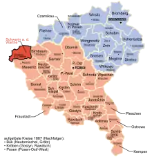 Kreis Schwerin an der Warthe (Polish: Powiat skwierzyński) was a district in Prussia, first in the southern administrative Region of Posen within the Prussian Province of Posen (until 1920), then within the Province of the Frontier March of Posen-West Prussia (until 1 October 1938) and at last as part of the administrative Region of Frankfurt within the Province of Brandenburg (until 1945). It presently lies in the western part of Polish region of Lubusz Voivodeship.