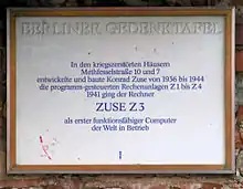 The DVL granted research subsidies so that in 1941 Zuse rented a workshop on the opposite side in Methfesselstraße 7 and stretching through the block to Belle-Alliance Straße 29 (renamed and renumbered as Mehringdamm 84 in 1947).[60] On 12 May 1941 Zuse presented the world's first functioning computer, Z3 built in his workshop, to the public.[61][62] While Z3 was destroyed with the workshop in an Allied Air raid in 1943 and the parental flat in the following year, the successor Z4 was constructed in a new premise in Oranienstraße 6 and evacuated from Berlin on 14 February 1945, only arriving in Göttingen two weeks later.[63]