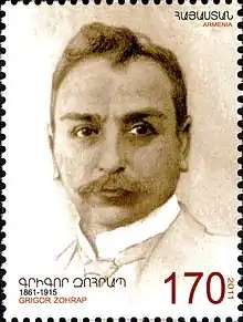 Krikor Zohrab (Armenian: Գրիգոր Զոհրապ; 26 June 1861 – 1915) was an influential Armenian writer, politician, and lawyer from Constantinople (now Istanbul). At the onset of the Armenian genocide he was arrested by the Turkish government and sent to appear before a military court in Diyarbakır. En route, at a locality called Karaköprü or Şeytanderesi on the outskirts of Urfa, he was murdered by a band of known brigands under the leadership of Çerkez Ahmet, Halil and Nazım some time between 15 July and 20 July 1915[1][2]