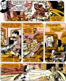 Kristoff would free himself with the aid of a Doombot sent to kidnap Franklin Richards, son of Mister Fantastic and the Invisible Woman,[6] by the recently resurrected Dr. Doom. Doom wanted to use Franklin as a bargaining chip for the soul of his mother which was held captive by Mephisto. Although still a child of about four or five, Franklin had powerful psychic powers which had enabled him to defeat Mephisto in a previous encounter.[7] This time, Doom's power inhibitors prevented Franklin from fighting the demon, who agreed to the bargain. But at that very moment, Kristoff, in full armor, burst in with an army of Doombots and challenged Doom, whom he thought to be an impostor.