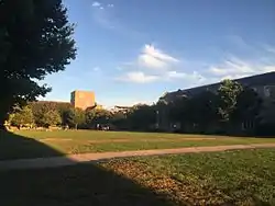 The main center of the College is O'Shaughnessy Hall, which hosts classrooms, art galleries, a coffee shop, and administrative offices. It was built in 1953 by Ellerbe Associates in Tudor Gothic style. Ground was broken for in July 1951 and the cornerstone was laid in May, The wings of the building meet at a central six-story tower. In addition to classrooms, the building also featured music rooms and 4 art galleries, which were later incorporated into the Snite Museum of Art. The high-beam decorated ceiling was painted by Alphonse Schmitt. The building was the gift of philanthropist Ignatius Aloysius O'Shaughnessy and cost $2,300,000.[3] Its Great Hall, which is decorated and sculpted on the outside, features a crucifix by Croatian sculptor Ivan Meštrović, a bust of Dean Charles E. Sheedy, and 7 stained glass windows, representing the seven liberal arts.[4] The Great Hall also hosts two tapestries that were rediscovered and restored in 2014 when the Hall was restored to its original appearance. One tapestry is of German or Belgian production from the 17th century, while the other one is from 18th century France.[5] It was featured in the movie Rudy.[6] Offices for most of the faculty of the College are housed in Decio and Malloy Halls, which are situated just West of O'Shaughnessy Hall.