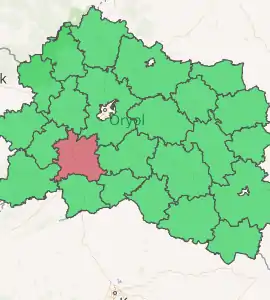 Kromskoy District (Russian: Кромской райо́н) is an administrative[1] and municipal[5] district (raion), one of the twenty-four in Oryol Oblast, Russia. It is located in the southwest of the oblast. The area of the district is 969 square kilometers (374 sq mi). Its administrative center is the urban locality (an urban-type settlement) of Kromy.[1] Population: 21,346 (2010 Census);[2] 24,400 (2002 Census);[7] 24,825 (1989 Census).[8] The population of Kromy accounts for 31.5% of the district's total population.[2]