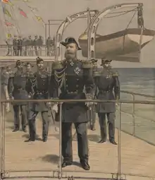 A French Navy squadron visited the Russian port of Kronstadt on the Gulf of Finland on 23 July 1891.[4] The squadron remained in the port for ten days during which it was granted an enthusiastic reception by the Russian populace.[5][6] The French national anthem, La Marseillaise - previously banned in Russia as an anthem of republicanism, was sung by the Dmitri Slaviansky D'Agreneff choir.[4] The Russian Emperor Alexander III, though known to be unenthusiastic about closer relationships with France, agreed to stand to attention during the singing of the anthem.[7] Many notable people travelled to visit the port from the national capital, Saint Petersburg, just 19 miles (31 km) away and crowds on the quayside cheered "Vive la France".[4] On 2 August the French officers were hosted at a meal in the capital. Some 600 guests attended and entertainment included the singing of both countries' national anthems and the performance of the second act of the French-language opera La fille du régiment.[4]
