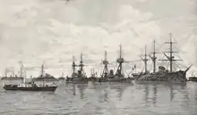 On 13 October 1893 the Russian Navy repaid the Kronstadt visit with a visit by a squadron under Rear Admiral Theodor Avellan to the French naval base at Toulon.[13][5] The Russian battleship Imperator Nikolai I from the Baltic was joined by the cruiser Pamiat Azova from Cadiz and the cruisers Admiral Nakhimov and Rynda travelling from the United States. The gunboat Terets later joined the squadron in port, from the Mediterranean.[13] The strength of the squadron sent was an indication of the political importance of the visit, which served to seal the mutual defence pact signed by the countries.[13][5] In France the visit was viewed as more serious than that at Kronstadt and was perceived to formally end the period of French diplomatic isolation.[14]