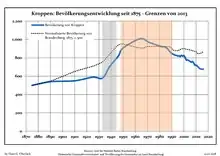Development of Population since 1875 within the Current Boundaries (Blue Line: Population; Dotted Line: Comparison to Population Development of Brandenburg state; Grey Background: Time of Nazi rule; Red Background: Time of Communist rule)