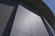 In accordance with the wishes of the lead donors, the building was designed to stand out from other buildings on the Hope campus. The distinctive "double lung" shape was partly inspired by the shape of a traditional artist’s palette and is also homage to the Guggenheim Museum in New York, one of the first Modernist museum buildings.[2] The façade of the building features a glass front with 700-pound Cambrian black granite panels sweeping around the sides in a dramatic saw-tooth pattern; according to Stone Ideas, this is an "eye-catcher" not only for its functional practicality, but also for its unique design.[6] The interior of the building features polished concrete floors, segmented walls and open ceilings that complement its modernist exterior and provide a visually dynamic environment for displaying art.[7]