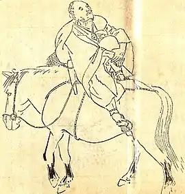Kumagai no Jirō Naozane (熊谷 次郎 直実) (March 24, 1141 – September 27, 1207/October 25, 1208) was a famous soldier who served the Genji (Minamoto) clan during the Heian period of Japanese history. Kumagai is particularly known for his exploits during the Genpei War, specifically for killing the young warrior Taira no Atsumori at the battle of Ichi-no-tani in 1184.[2] Later in life he became a Jōdo-shū Buddhist priest, as a disciple of Hōnen. Atsumori's death and the circumstances surrounding it went on to be fictionalized and retold in numerous forms, including the Heike Monogatari epic, a number of Noh plays, and in the jōruri and kabuki theatres as well.