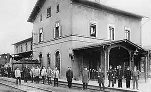 The entrance station at its opening was built in the style of the other Palatine stations that were built in the 1860s and 1870s, inspired and equipped accordingly with external plasterwork. In accordance with the importance of the station it has a relatively large gable facing the tracks and the street. It has two and a half floors that were originally equipped with staff accommodation and administrative offices. Directly next to it there was a two-storey goods shed, which was created with the sloped part of the roof facing the station. Both the station and the goods shed experienced some structural changes and the latter was also expanded in the coming decades. There was a wooden porch at the western end of the station building.[21] The station building is no longer used for rail operations.[22]