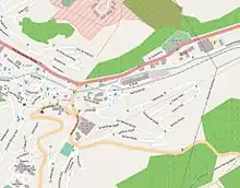 The Kusel–Landstuhl railway comes from the east and follows the Kuselbach (brook) from Altenglan. From the Rammelsbach station it rises at a gradient of 1:133.[7] From 1936 to 1970, it continued directly on to the link to Türkismühle, but through passenger services ended in 1951. The former line crossed the Kuselbach (brook) immediately after leaving the station and proceeded along its left (north) bank.