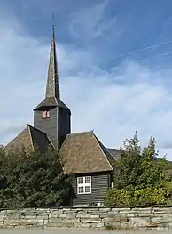 The first church at Kvam was a wooden stave church that was likely built in the 13th century. This church was located along the river Gudbrandsdalslågen at Vik, about 1.5 kilometres (0.93 mi) to the east of the present church site. Not much is known of the old stave church. Its exact location is unknown; however, it is likely that the current road and railway line runs over the church site because coffins were found during the excavation and construction of both.[3][4]