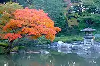 The Japanese garden is surrounded by a deep forest. The Western building and garden are hidden by tall trees. In the centre of the stroll garden is an artificial pond called "Shinji-ike" ("Heart letter pond"). The pond's shoreline is designed in the shape of the Kanji "心(Shin)", which means "heart". Around the pond are Tōrōs (stone lanterns), artificial hills, water falls, islands, and a tea ceremony house.[4] The park in its current state was opened to the public in 1956.[2]