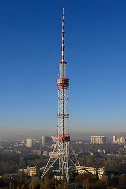 The Kyiv TV Tower (Ukrainian: Телевізійна вежа, romanized: Televiziyna vezha) is a 385 m-high (1,263 ft) lattice metal tower[1] on Oranzhereina Street, Kyiv, Ukraine, and is the tallest structure in the country.[2] The tower was built in 1973 while Kyiv was the capital of Ukraine SSR.[3] The tower was the tallest free-standing metal structure in the world[1][2] until being surpassed by the Tokyo Skytree in 2012. It is used for radio and television broadcasting and is not open to the public.[1]