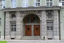 Entrance to the Munich police headquarters built 1910–1913.- March 1914: The Munich police has moved into its new headquarters. Adolf Hitler, a young painter from Austria, comes in to have his permit of residence extended. Lederer and novice Dannenberger are detached to monitor a speech held by socialist Rosa Luxemburg.