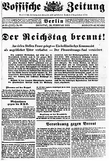 - February 28, 1933: Traudl Grandauer persuades her husband Karl to go to Kurt and Sara's Shrove Tuesday party; when they come back home in the early morning, they receive news that Grüner is in hospital after suffering a stroke. Meanwhile, the Dutch communist Marinus van der Lubbe is presented as the culprit for the Reichstag fire, and Hindenburg promptly issues the Decree for the Protection of People and State, massively curtailing people's personal freedoms, including the right to express one's opinion, freedom of the press, the right to organize and assemble, and the privacy of postal, telegraphic, and telephonic communications.[11]