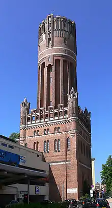 Lüneburg Water Tower (German: Wasserturm Lüneburg) is a water tower in the southeastern part of the Lüneburg old town in Lower Saxony, Germany, built by the architect Franz Krüger (1873–1936), from designs by Richard Kampf. Its erection was initiated on 3 October 1905, and the tower was taken into use in November 1907.[1] The water tower is 55 metres (180 ft) tall, and is the tallest building in the Lüneburg old town that is not a church. It stands between the considerably newer Nordlandhalle and the Johanneum, the latter now used as a school. The tower consists of a square base of 18 metres (59 ft) and a round portion which is walled up around a 500 cubic metres (18,000 cu ft) large water tank. The upper part is carried by 16 solid columns.