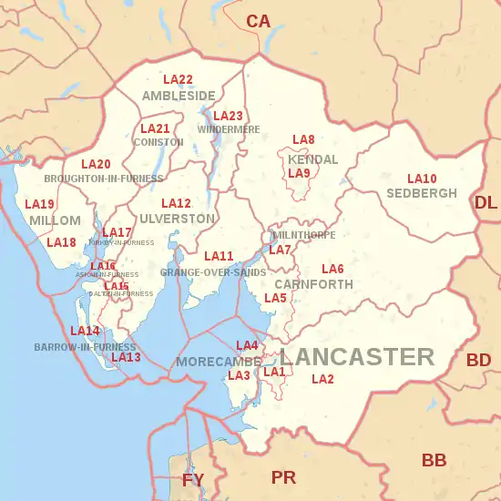The LA postcode area, also known as the Lancaster postcode area,[2] is a group of 23 postcode districts in north-west England, within 17 post towns. These cover north Lancashire (including Lancaster, Morecambe and Carnforth), south Cumbria (including Barrow-in-Furness, Kendal, Ulverston, Windermere, Dalton-in-Furness, Millom, Milnthorpe, Sedbergh, Grange-over-Sands, Askam-in-Furness, Kirkby-in-Furness, Broughton-in-Furness, Coniston and Ambleside) and a small part of North Yorkshire.