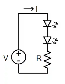 Strings of multiple LEDs are normally connected in series. In one configuration, the source voltage must be greater than or equal to the sum of the individual LED voltages; typically the LED voltages add up to around two-thirds of the supply voltage. A single current-limiting resistor may be used for each string.