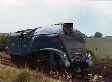 Withdrawn from service by British Railways on 1 February 1966, it was targeted by the A4 Preservation Society, which was soon renamed the A4 Locomotive Society, to rescue the locomotive from the cutter's torch. This was achieved, and the "Streak" was moved to Crewe for refurbishment.[3] Fellow A4 No 60026 Miles Beevor also subsequently visited the former LMS works after its own withdrawal, and its three pairs of 6 ft 8 in driving wheels were transferred to No. 60007 because they were in a far better condition than those on the newly saved engine.[4]
