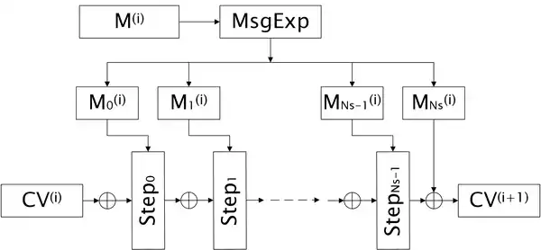 In this stage, the 32-word array message blocks , which are generated from a message in the initialization stage, are compressed by iteration of compression functions. The compression function has two inputs; the -th 16-word chaining variable and the -th 32-word message block . And it returns the -th 16-word chaining variable . Here and subsequently, denotes the set of all -word arrays for .