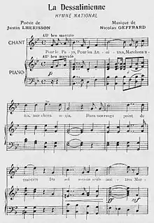 "La Dessalinienne" (French pronunciation: [la dɛs.salinjɛn]; Haitian Creole: "Desalinyèn"; English: "The Dessalines Song") is the national anthem of Haiti. It was written by Justin Lhérisson and composed by Nicolas Geffrard.[1][2]