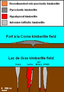 The Eocene (ca. 55-50 Ma) age diatremes of the Lac de Gras kimberlite field support two world-class diamond mines called Ekati and Diavik.[2] Ekati, Canada's first diamond mine,[3] has produced 40,000,000 carats (8,000 kg) of diamonds out of six open pits between 1998 and 2008,[3] while Diavik to the southeast has produced 35,400,000 carats (7,080 kg) of diamonds since its foundation in 2003.[4]