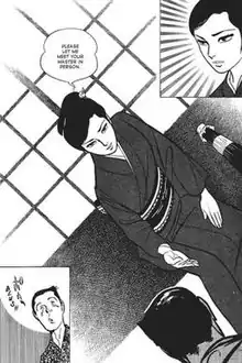 In chapter 13, a photographer uses men to rape his female clients. The photos of the rape are then used as blackmail. Oyuki is hired to destroy the photos and slay the photographer. In chapter 14, Gishiro captures Mr. Miyanara. Oyuki, disguised as an old lady, slips into Gishiro's house and murders him in cold blood, leaving only Hanzo Takameru. In chapter 15, Hanzo Takameru is now an old man with a young daughter supporting him. Oyuki kills Hanzo, but saves his young daughter from being sold as a prostitute. She lies to her that her father committed suicide. Finally obtaining retribution for her mother, the final panel shows an umbrella, which houses Oyuki's blade, being tossed into the sea. | ||||
