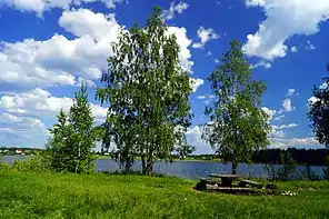 Lake Beloye (Russian: Бе́лое о́зеро, IPA: [ˈbʲɛləjə ˈozʲɪrə] — literally White lake) is a lake in Klepikovsky District, Ryazan Oblast, Russia. It is notable for its relatively great depth for the region - 50 metres (160 ft) - created as a deep gouge in the landscape in the most recent glaciation.[1] The lake is located in the Meshchyera Lowlands, a glacial alluvial plain of swampy lowlands, gravelly moraines and limestone bedrock.[2] It was once connected by an artificial canal to Lake Velikoye ("Grand Lake", a much larger lake with a surface area of 20 square kilometres (7.7 sq mi)). The canal was filled in 2009. Lake Beloye is surrounded by pine forests, with reeds and sedge predominating on the shore. It is a popular lake for recreation and fishing, being home to pike, carp and other fish.