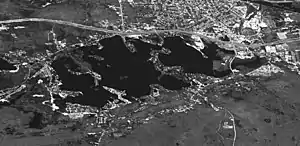 The lake is commonly divided into three smaller bodies of water: North Pond, Middle Pond, and South Pond. They are connected by narrow channels.[17]