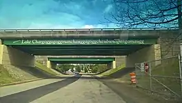 The exaggerated name "Lake Chargoggagoggmanchauggagoggchaubunagungamaugg" (/ˌleɪk tʃɚˈɡɒɡəɡɒɡ ˌmænˈtʃɔːɡəɡɒɡ tʃəˌbʌnəˈɡʌŋɡəmɔːɡ/)[8][9] is a 45-letter alternative name for this body of fresh water, often cited as the longest place name in the United States[10] and one of the longest in the world. Many area residents, as well as the official website of the town of Webster, consider the longer version correct.[11]