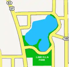 Lake Ella is incorporated into the 6.5 acre (26,000 m²) Fred Drake Park. The park has picnic shelters, a site for community activities such as amateur astronomy and exercising, and a paved walking trail that completely encircles the lake. Visitors can walk, skate, or skateboard the 0.6 mi around the lake. Visitors also enjoy feeding the many ducks, geese, pigeons, and turtles that live at the lake.