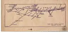 Several physical remnants of the Lake Shore Electric can still be found today. In the cities of Bay Village and Avon Lake are streets named "Electric," running over the former right-of-way.[7][8] Also, bridge piers can be found at the Cleveland Metroparks Huntington Reservation and in Rose Hill Park, both in Bay Village, and at several other locations.[9] Some former LSE structures remain standing, and have been converted to other uses. Much of its route can still be traced in northern Ohio by power lines on unusually high utility poles, where LSE's former electrical transmission infrastructure became the property of area utility companies.