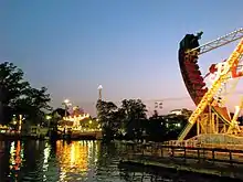 Lake Winnepesaukah is modeled after a classic American fair theme with a midway layout featuring food, games, and amusement rides. The park's venue is the "Jukebox Junction," an open air theater that is used for concerts and as a playground for children. The park expanded in 2013 with the addition of a water park called Soak Ya with several water attractions. The park also featured the only known working Eyerly Fly-O-Plane attraction in the United States until it closed in 2017. Family-oriented rides include the Wacky Factory, tilt-a-whirl, matterhorn, balloon race, paratrooper, orbiter, pirate ship, scrambler, a ferris wheel, Genie, Fire Ball, bumper cars, paddle boats, a tour train, and several other family and thrill rides.[4][5] In 2005, several rides from an amusement park in Panama City Beach, Florida, were brought to Lake Winnie for its 80th birthday celebration. After the revival of Miracle Strip closed down, several of its rides permanently relocated to Lake Winnespesaukah, including The Bumble Bees, The Free Whale, Kiddie Boats and The Ferris Wheel.