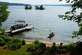 Lake Winnisquam is in Belknap County in the Lakes Region of central New Hampshire, United States, in the communities of Meredith, Laconia, Sanbornton, Belmont, and Tilton. At 4,214 acres (1,705 ha),[1] it is the fourth-largest lake entirely in New Hampshire. The lake is roughly triangular in shape, with the vertexes pointing north, east, and south. The lake lies along the path of the Winnipesaukee River, which enters the lake from its eastern corner and carries water from Lake Winnipesaukee via Paugus Bay and Opechee Bay. The river also flows south out of Winnisquam's southern corner, eventually joining the Merrimack River. The lake extends several miles north from the course of the Winnipesaukee River, which forms the lake's southeastern side, with the northern point being formed by the confluence of several smaller creeks near the village of Meredith Center. The lake has a maximum depth of 155 feet (47 m).[2]