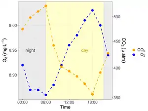 On a daily scale, GPP rates are most affected by the diel cycle of photosynthetically active radiation while ER is largely affected by changes in water temperature.[53] Additionally, ER rates are also tied to the quantity or quality of the organic substrate and relative contributions of autotrophic and heterotrophic respiration, as indicated by studies of the patterns of night-time respiration (e.g Sadro et al 2014[10]). For example, bacterioplankton respiration can be higher during the day and in the first hours of the night, due to the higher availability of labile dissolved organic matter produced by phytoplankton. As the sun rises, there is a rapid increase in primary production in the lake, often making it autotrophic (NEP > 0) and reducing dissolved CO2 that was produced from carbon mineralization that occurred during the night. This behavior continues until reaching a peak in NEP, typically around the maximum light availability. Then there is a tendency for the NEP to fall steadily between the hours of maximum light availability until the next day's sunrise.