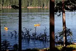 In addition to fish, the lake provides habitat for a wide variety of bird species. From the Forest Service campgrounds along the lake shore, birdwatchers can see grebes, ducks, geese, and occasionally common loons. The lake also attracts birds of prey including osprey and bald eagles. In the forest around the lake, there are mountain chickadees, western tanagers, red-breasted nuthatch, yellow-rumped warbler, red crossbills, hermit thrush, golden-crowned kinglet, Steller's jays, Canada jays, Vaux's swifts, common nighthawk, hairy woodpeckers, downy woodpeckers, and pileated woodpeckers. The forest is also home to a number of owl species including great horned owls, great gray owls, northern spotted owls, northern saw-whet owls, and northern pygmy-owls.[10]