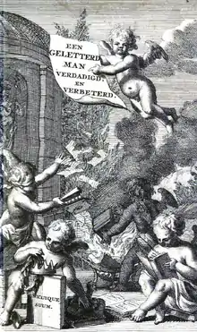 Bidloo was a fervid Zonist from the beginning of the schism and wrote contentious pamphlets against the Lamists' more inclusive and tolerant views of the "Flemish" congregation: "Op te Lamm".[13] Bidloo's contemporary and fellow Zonist, Thieleman J. van Braght, produced a martyrology—Martyrs Mirror—for his co-religionists.[14] The book became a fundamental text for all Anabaptists, especially through Jan Luiken's illustrated second edition of 1685.[15] In a similar vein, but with a smaller scope was one of the first publications of Lambert's brother Govert, Letters of the Marytyred Apostles (1675).[16] During Govert's lifetime there were 20 editions of his work which include a poem contributed "by his brother".[17] While Mennonite beliefs were an important components in the art (Rembrandt) and poetry (Vondel) of the Dutch Golden Age, Bidloo's conservative religious beliefs distanced him from the Dutch origins of the "Radical Enlightenment".[18]