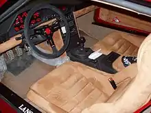 The Stradale's chassis was a space frame, similar to its rally counterpart, built out of CrMo steel tubes and aluminium alloy for the crash structures; it was covered by epoxy and fiberglass body panels. Like the rally car, the 1.8-litre four-cylinder engine was longitudinally mid-mounted, equipped with Weber-Marelli IAW integrated electronic ignition and fuel injection, a supercharger, a turbocharger and two intercoolers. In road tune the 1.8 produced 250 PS (184 kW; 247 hp)[7] at 6750 rpm and 291 N⋅m (215 lb⋅ft) of torque at 4500 rpm.[5] The "Stradale" kept a three differential four-wheel-drive system from the rally car; the centre differential sent 30% of the engine torque to the front open differential, and 70% to the rear limited slip.