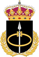 The coat of the arms of the Land Warfare Centre used from 1999. Blazon: "Sable, a spear issuant argent surmounted by an old arm bracelet or. The shield surrounded by an open wreath of laurel or".[14]