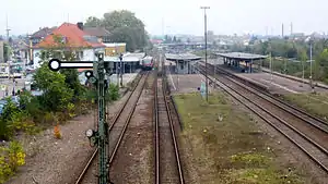![]() Track field and platforms with a Regionalbahn service to Pirmasens | ||||||||||||||||||||||||||
