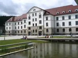 The Landesgymnasium's campus is situated at the University park in the east of Schwäbisch Gmünd. During the 20th century it was used as barracks initially by the German Army (Bismarck Kaserne) and then after WWII as a US military base with nuclear Pershing II missiles stationed nearby, which were eliminated in 1990. In 1992, the US forces withdrew and the campus was used as a spin-out of the University of Maryland University College until 2002. School building, boarding houses and teachers' flats are situated in the recently renovated barracks while the canteen and a gym were newly built on the former parade ground.[1]