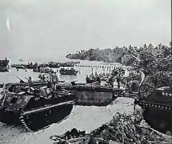 The attack group arrived in the transport area at 06:05 on 20 March. The LVTs were launched, and the assault troops transferred to the amphibious tractors using the APDs' boats, supplemented by those from Callaway while Vought F4U Corsairs of VMF-218 flew overhead to make a last-minute check of the island for any signs of the Japanese. The assault waves touched down on schedule. The reserve 3rd Battalion's boats grounded on the reef soon afterwards, and its marines waded ashore through knee deep water. The only problem encountered was with launching the LCTs carrying the tanks. The LSD's flooding mechanism failed and the LCTs had to be dragged out by a fleet tug.[13] While the detachment sent to occupy Elomusao Island was approaching the beach, some supposed opposition caused the amphibious tractors and then a destroyer to open fire, and a man was wounded by a shell fragment. However, the natives informed the marines that the Japanese had left Emirau two months before and only a small detachment remained on Mussau Island.[14] Supplies began landing at around 1100, first from the APDs and then from Callaway. Some 3,727 troops and 844 tons of cargo were ashore were by nightfall, when the ships sailed.[13] Within a month, some 18,000 men and 44,000 tons of supplies had been landed.[6]