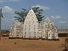 According to a legend, in 1421, an Islamic trader named Ayuba had a dream while staying here, near a "Mystic Stone", instructing him to build a mosque. Strangely, when he awoke, he found that the foundations were already in place and he proceeded to construct the mosque until it was completed.[2][3] There is a belief that he left instructions that he should be buried close to the mosque and that after three days, the baobab which would shoot up on his grave was to be preserved from generation to generation. The baobab tree next to the mosque today is reputed to mark the site of Ayuba's grave.[2] The townsfolk of Larabanga supposedly depend on the leaves and stem of this baobab tree for healing of ailments.